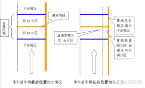 ⑴、车辆停车后前后位置分为三种情况(各地考试评判标准可能有所不同):