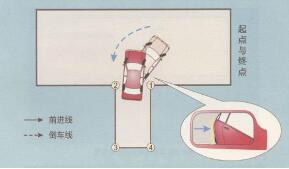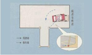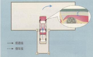 4、观察车外后视镜,适当调整车身与车库边线的距离。当左前门把手与车库底线(即位置3, 4的连线)重合时,立即停车,如下图所示: