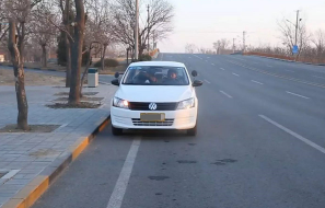 4、在车速降低至低于一档的时速时踩下离合器踏板,当右前轮靠近路沿时,再向左转方向(第二把轮,调正车辆并且调整车身与路沿的距离)。