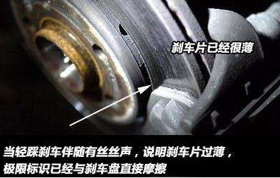 听声音如果在轻点刹车的同时伴随有“铁蹭铁”的咝咝声(也有可能是刹车片在刚开始安装时磨合产生的作用),此时刹车片必须立即更换。因为刹车片两侧的极限标识已经直接摩擦刹车盘,证明刹车片已经超过极限。遇到这种情况,在更换刹车片的同时要配合刹车盘的检查,出现这种声音时往往刹车盘已经受到损坏,此时即便更换新的刹车片仍然不能消除响声,严重时需要更换刹车盘。