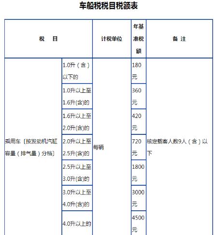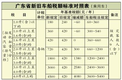 根据驾照网查询到的确实消息,2016车船税新标准已出炉,对于普通的私家车(9座以下),几个地方的标准为:北京每年应缴纳480元,上海为450元,山东为420元,重庆为400元,而江苏为360元。而广东的税目额表如下: