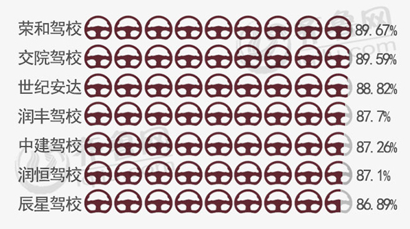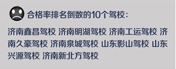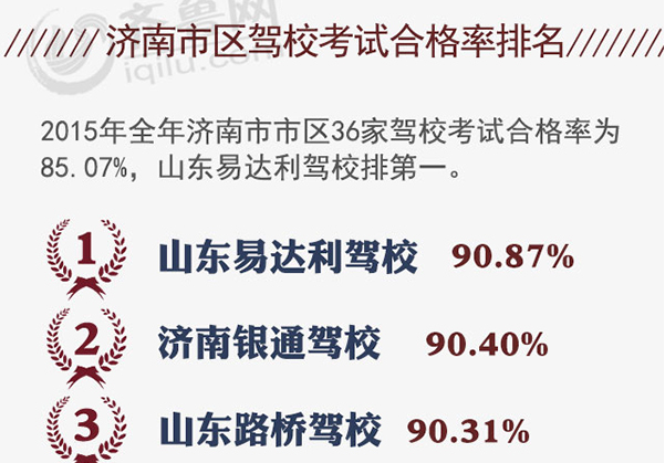 2015年全年济南市市区36家驾校考试合格率为85.07%,其中考试合格率排名前十位的是:山东易达利驾校、济南银通驾校、山东路桥驾校、济南荣和驾校、山东交院驾校、济南世纪安达驾校、济南润丰驾校、济南中建驾校、济南润恒驾校、济南辰星驾校。