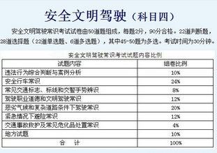 科目四考试是从题库中抽取50题作为考题。总分100分,90分合格。考试题类型采用情景判断、事故案例分析等形式,考试内容包括安全驾驶常识、驾驶职业道德、恶劣条件驾驶、紧急情况避险和事故救护等知识。考试题库全国统一,各总队要结合本地交通安全形势和交通事故特点,增加10%的地方题库。结合重特大道路交通事故暴露出的问题和不同时期交通违法行为的变化情况,及时调整、更新考试题库。