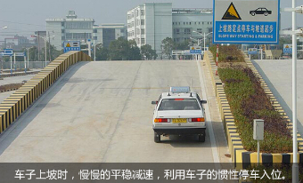 上坡路定点停车,一要慢,控制住车速;二要看,找参照物,看停车的位置是否正确;三要稳,拉紧手刹等,避免溜车危险。