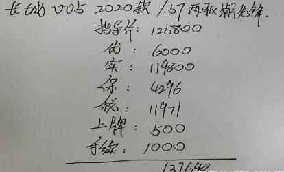 长城WEY VV5 2020款 1.5T 两驱潮先锋 官方指导价12.58万,也是VV5在售车型指导价最低的一款,中山地区目前最高有6,000元的现金优惠,也相当于这款VV5的裸车价是11.98万,全款购车加上购置税、交强险、车船税、商业险、上牌费以及其它手续费,最后这款长城VV5落地价137,698元。