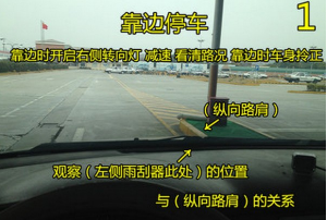 观察车身右侧与马路边缘或马路牙子之间的距离,进行调整。直至右侧前门把手位置,将遮住马路牙,或者将"接触"时,迅速顺直车身。