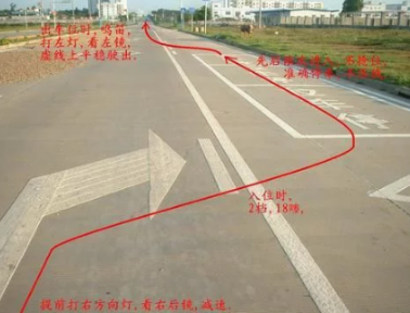 在车速降低至低于一档的时速时踩下离合器踏板,当右前轮靠近路沿时,再向左转方向(第二把轮,调正车辆并且调整车身与路沿的距离)。