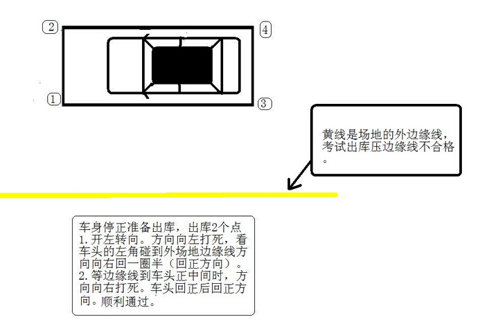 (9)车沿左侧前进,当左后视镜见左后车轮前行压库外线后,方向盘回正(右打1圈半)。右后视镜内看到右后轮出库线后,向右打死。出库后车身与库边线平行后立即将方向盘回正(即向左回1圈),直行驶离开侧方位停车考试区域。