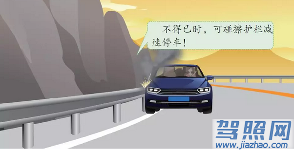 下坡行驶中制动突然失效时,在不得已的情况下,可将车身靠向山坡、路旁的岩石、树木或护栏碰擦,迫使机动车减速停车。