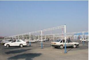 以岑村车管所考场为例,直角转弯结束后,考生需驾车通过一个下坡,右转至倒车入库考场。倒车入库为“T”字形。