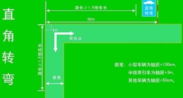 进入直角转弯前,让车在路两边线内尽量远离转弯点的标志杆向前慢速行驶;当靠近转弯点一侧的前车窗上小三角窗中心与转弯点重合时,向转弯点一侧打方向到底,通过后车头正时回正方向。车身右侧靠近外直角边线前进,左、右前车门三角窗中间对准内、外直角线时方向向左、右打到底,车正时回正。