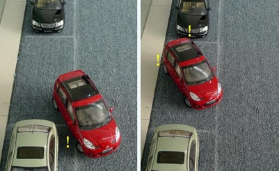 当驾驶视线与车辆引擎盖右前角行程的直线在参照车左轮之后,保证车头安全进入,从右后窗中观察参照车辆露出面积不足1/4时,可保证车尾能进入。