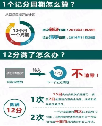 (四)充分利用12分的技巧。告诉您一个处理违章小窍门!如果您要处理违章,以本文展示的驾驶证为例,记分清零时间为每年的9月16日24时,最好要在8月17日前后查看一下自己驾驶证的记分情况,如果还有处理罚分的空间,可以在9月6前后处理有扣分的罚款(为银行罚款对账空余出时间),这样假设您扣了11分,也会在几天后进入新的计分周期,驾证又变回0分。如果车上有罚分的违章没处理,而你的上一个记分周期内的记分没有充分利用,可是有点冤枉啊。要知道现在监控十分发达,每个车上都可能有罚分的违章。