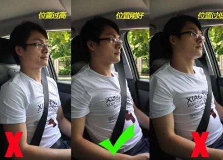 当安全带肩带位置太高时,会有可能割伤驾乘人员颈部;而当安全带肩带位置太低时,安全带肩带容易滑落导致无法限制驾乘人员身体前倾。所以在调节安全带高度时,我们应使安全带肩带跨过我们肩部的中央。