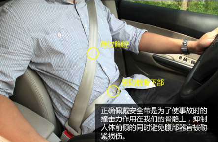 安全带肩带和腰带的主要作用是为了在事故时缓冲驾乘人员向前或者向后的惯性,尽量把其固定在座椅上。正确佩戴安全带时,肩带应该跨过胸腔,腰带应该紧贴髋骨。这样做主要是为了使事故时的冲击力作用在我们的骨骼上而不是我们柔软的内脏器官上。