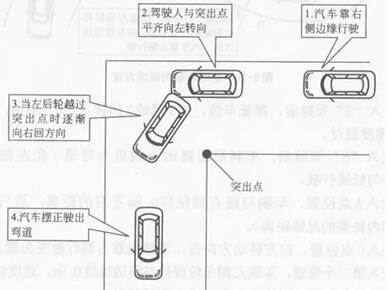 4、当左后轮越过内直角突出点时,开始逐渐向右回方向驶出弯道;
