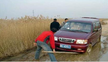 或者挖去泥浆或用木杠撬起车轮,设法在轮胎与泥泞之间填塞石块、木料等硬质物,以增加摩擦力,用木杠撬起车轮自救;