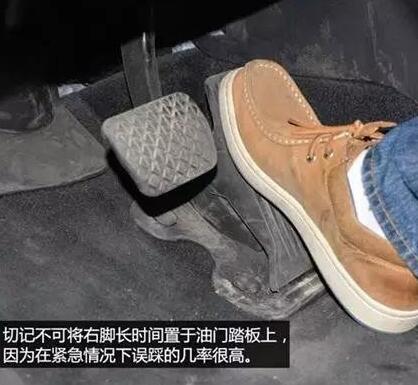 许多人喜欢将脚放在油门旁,而紧急情况人的本能反应是去踩离脚最近的踏板,如果平时将右脚放在刹车板一侧,就能避免这样的悲剧发生。