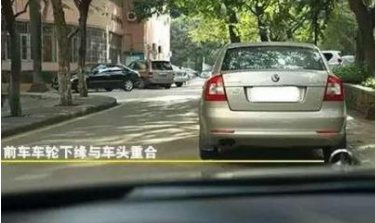 判断与前车的距离,可以通过目测车辆前部遮挡前车后部的位置来确定。