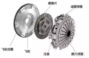 离合器是位于汽车大心脏——发动机和变速器之间可以实现动力的传递和中断的重要部件。目前我们考试用车用的比较多的都是摩擦式离合器。离合器被固定在发动机的飞轮上。压盘与飞轮一起转动,摩擦片(即从动盘)通过花键与变速器的输入轴结合。通过控制压盘的轴向移动,使之压向从动盘进而贴合飞轮,带动从动盘转动从而实现动力传递。在我们控制半联动时,离合器磨擦片在压盘和飞轮之间,既传递力矩,又产生滑转。