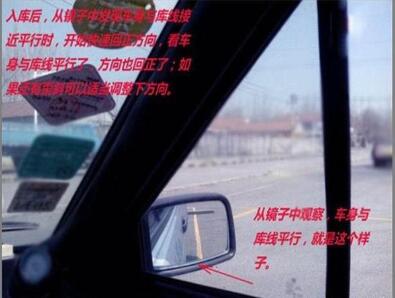 (三)左倒库回正:如果快要压左边线,则回正车头等后车轮进去再往左打方向适当调整。