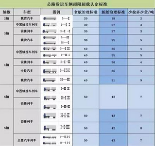 按照即将于9月21日起施行的新标准,2轴货车车货总重不得超过18吨;3轴货车不得超过25吨,3轴汽车列车不得超过27吨;4轴货车不得超过31吨,4轴汽车列车不得超过36吨;5轴汽车列车不得超过43吨;6轴及6轴以上汽车列车不得超过49吨,其中牵引车驱动轴为单轴的,其车货总质量不得超过46吨。同时,还对车货长宽高进行了明确:总高度从地面算起不得超过4米,车货总宽度不得超过2.55米,车货总长度不得超过18.1米。