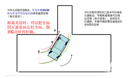 当车右后轮行至B点,车身个侧30CM处与车身平行的延长线将要碰到目标,一般回半圈方向或四分之一,适当把弧线略拉直即可,车身外侧30CM处与车身平行的延长线其实很好确定,当车以居中的位置停在车库中时,库边线就是这条线,它在反光镜上的位置是固定的。