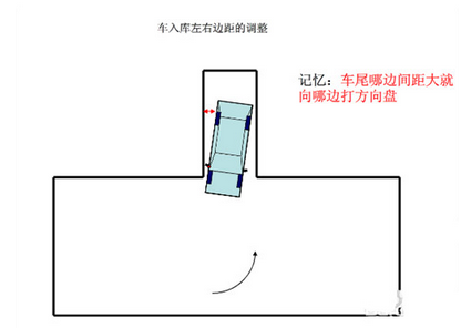 车入库左右边距修正,车尾哪边间距大就向哪边打方向盘。