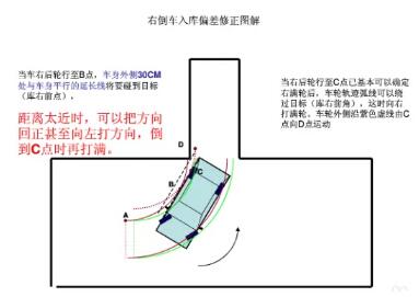 这时需要回一圈,然后继续倒,车身正时再回一圈,使车轮回正,然后稳稳进库了,进库后可以微调 ;