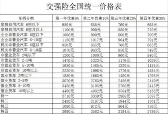 同一车型,全国执行统一价格。无论是奇瑞qq,还是宝马奔驰保时捷卡宴都属于6座以下的乘用车,第一年交强险保费950,之后按照上面所写情况浮动变化。