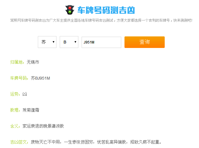 先介绍一下车牌号码吉凶测试系统的使用。这个系统不管在哪个地方出现的形式都是一样,只要在搜索引擎,如百度上输入“车牌号码吉凶测试”就可以找到许多,下面是我利用这个测试系统测试苏BJ951M这个车牌号的结果截图。
