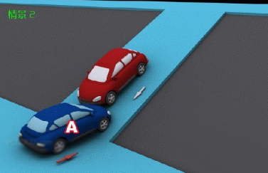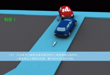 (十)情景1:在没有中心隔离设施或者没有中心线的道路上会车时,下坡车未让上皮车先行的,图中所示为A车负全责。