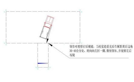 左后门窗角对杆,点前打死点后回;车尾入库速看镜,车身平行回两圈。