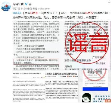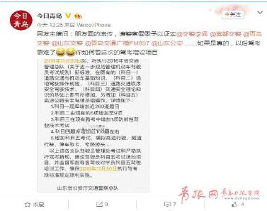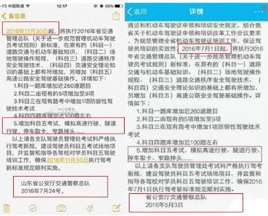 7月25日,微博网友@今日青岛发微博称:朋友圈流传“2016年11月30日起,将执行2016年省交通管理总队新标准,在原有的(科目一)道路交通与机动车基础知识、(科目二)场地驾驶操作规程、(科目三)道路交通秩序安全驾驶技术、(科目四)交通安全理论知识的基础上都有所增加,另增加(科目五)高速公路安全驾驶基础操作”并附上相关具体情况,最后落款为“山东省公安厅交通警察总队”。