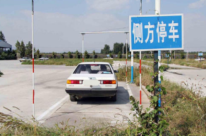 接下来是摆车。主要方法为:用半联动起步,有把握也可以适当加油。起步要遵循一踩,二挂,三转向,四鸣笛,五瞭望的原则,并把车平行停在离库30-50厘米的位置,车尾要过最前方的杆。