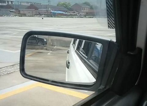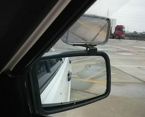 四. 方向起早(如下图,车身右侧与库位右前角45公分相交时,这个距离点出现在前门把手上,那么此时不是回半圈了。第一步,应该回一圈,避免右侧车身压角或压线。第二步,再继续观察右后视镜,右库角在镜子里完全消失后,方向重新往右打死,以避免车身左后侧扫线或压线。第三步,车身左侧与边线平行回一圈半方向,接下来准备停车。