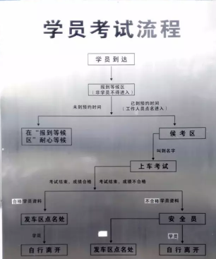 11、学员考试完毕,如成绩合格,需将考试资料上交到发车区点名处,并说明成绩合格;如成绩不合格,考试资料则由安全员统一上交至发车区点名处,学员自行离开即可。
