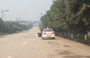 这个方法适合在晴天时候用,晴天的时候,路上会有明显的车轮印,因为大家停车都在这些地方停。保持车轮沿着这黑色的车轮印走,那距离边线就在30公分以内啦!如果觉得很难把握车轮沿着印子走,也可以保持人在两个车轮印中间的白色区域,效果是一样的。