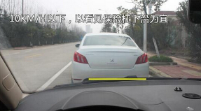 在10KM/H以下的时候,以看见前车保险杠下沿为宜