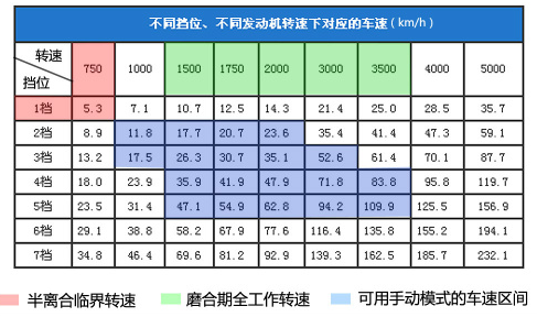 红色区域表示半离合的临界转速。从上表可以看到,使用D档当车速降到5km/h以下时,发动机转速只能降到怠速,而这时只能靠半离合的状态来应付,不然发动机就会熄火。所以当在塞车时,等红绿灯时,可用空挡+刹车,可以减少离合器半离合的滑磨。