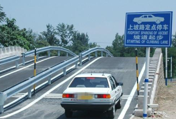 (1)听到“坡道定点停车”指令后(立刻打开右转向灯),向场地右侧靠;(起步时如果有坡度时,为防止溜坡,要用半坡起步法起步)。