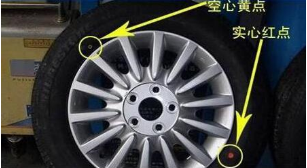 每条轮胎上都有一个红点和黄点,你仔细的观察会发现红点是实心的,而黄点是空心的。