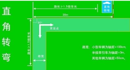 直角转弯的操作要领是(以由右向左转弯为例)进入直角转弯区,要使车辆右侧与路边线保持在30厘米的距离(此距离非常关键,若距离过近容易造成车右侧轧线,若距离过远,不能有效地利用路面的宽度,则造成操作失败)直线前进,保持正确的驾驶姿势,当视线所观察到的车辆的最前端与前路边线重合时,便可迅速将方向盘向左转到底,等到车身完全转过,车头正直后迅速将方向回正,直角转弯结束。