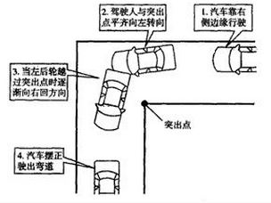 进入直角转弯区域前,让车在路两边线内尽量远离转弯点的标志杆向前慢速行驶;当靠近转弯点一侧的前车窗上小三角窗中心与转弯点重合时,向转弯点一侧打方向到底,通过后车头正时回正方向。车身右侧靠近外直角边线前进,左、右前车门三角窗中间对准内、外直角线时方向向左、右打到底,车正时回正。