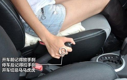 第四:右脚踩油门,左脚慢慢抬起离合器,左手稳住方向盘,右手握住手动刹车前端;待听到油门声音由“高昂”转变到“沉稳”的时候,迅速放下手动刹车。