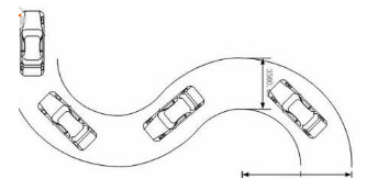 2、进入第一个弯道,车辆沿道路的右侧进入弯道(距左侧路边缘约1米),保持匀低速行驶,向左打方向盘,车辆由靠右侧行驶变为靠左侧行驶。