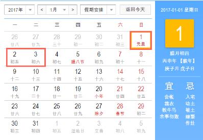 2017元旦放假安排时间:2017年1月1日至1月3日调休,放假3天、2017年1月1日(星期日)为国家法定节假日、2017年1月4日(星期三)照常上班。