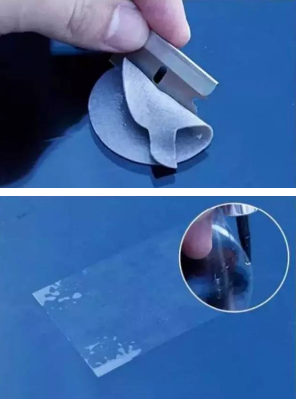 用安全刀片将支架撬开撕掉,然后将剩余的修复液涂抹在裂纹上。贴上塑料片,用刀片将气泡挤出。在阳光直射的情况下等待15分钟,如果是阴天或者光线不足的话要等上一个小时。当然,真正达到完全固化需要两三天时间。