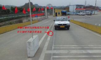 (2)即将到达路边时,方向向左回半小圈,再迅速向右回正,使车右侧与路边保持平行,并距离在30CM内(保持左雨刷中部连接部件(黑色方块)在白色线与黄色线之间,不能压黄色线;最好压白色虚线走,或用左筋线对准标志线走);起步后,可完全放开离合(或用离合控制,车速快一点,不易熄火)进行上坡(上坡过程中),如果车出现明显抖动,可踩一点离合,可保持不熄火)。