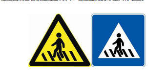 如下图,左边黄底警告的是注意行人;右边蓝底的才是人行横道。